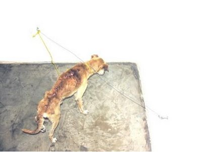 Uno de los trabajos expuestos consistió en presentar a un perro famélico que Haba recogió de la calle, y durante la exposición aparecía amarrado con una cuerda de nylon, que a su vez estaba sujeta a otra cuerda que pendía de dos clavos en una esquina de la Galería.