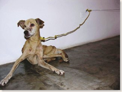 Uno de los trabajos expuestos consistió en presentar a un perro famélico que Haba recogió de la calle, y durante la exposición aparecía amarrado con una cuerda de nylon, que a su vez estaba sujeta a otra cuerda que pendía de dos clavos en una esquina de la Galería.